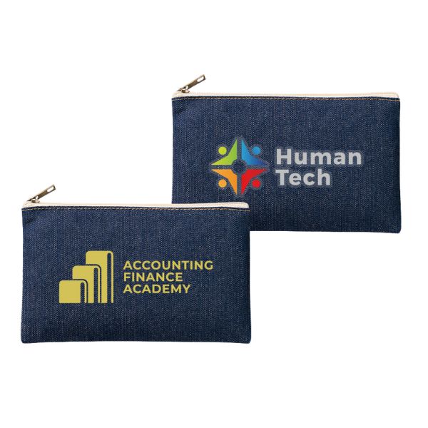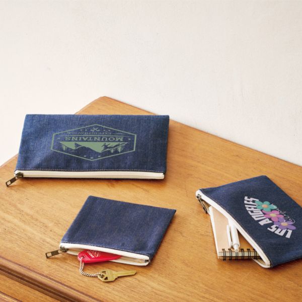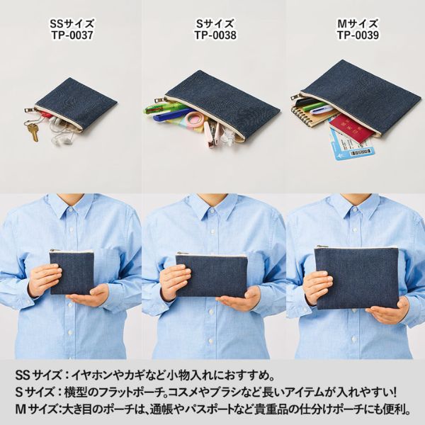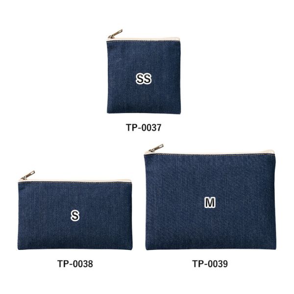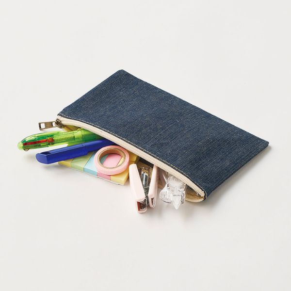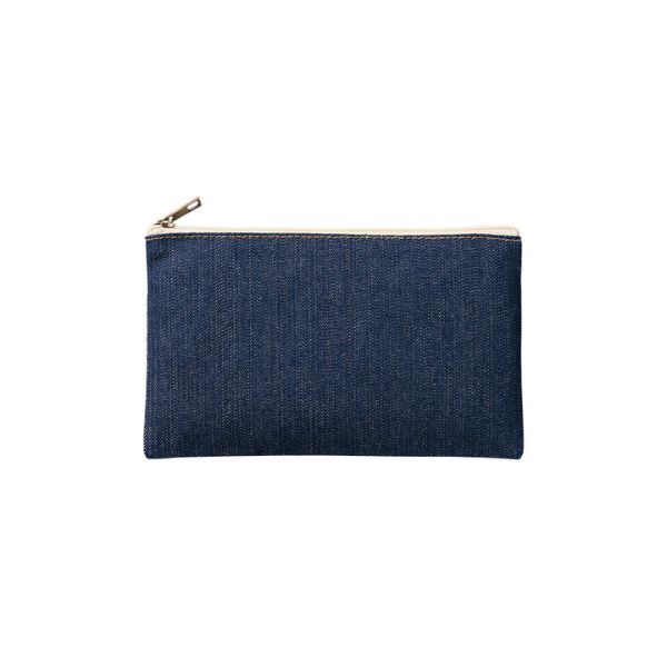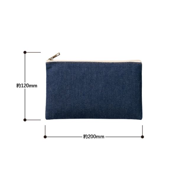 デニムタイプの、おしゃれなフラットタイプポーチ。ペンケースやコスメケースとして活用するのに最適なサイズです。