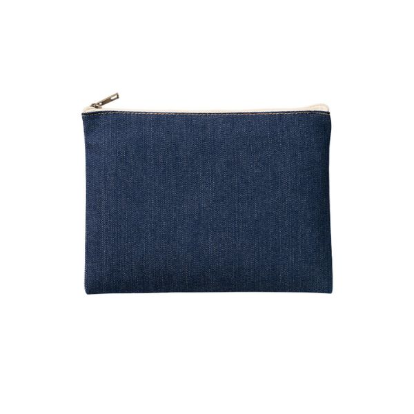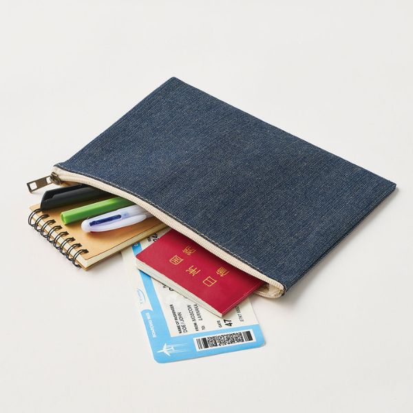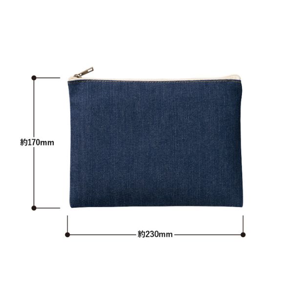 デニムタイプの、おしゃれなフラットタイプポーチ。通帳やカードを収納するのに最適なサイズです。